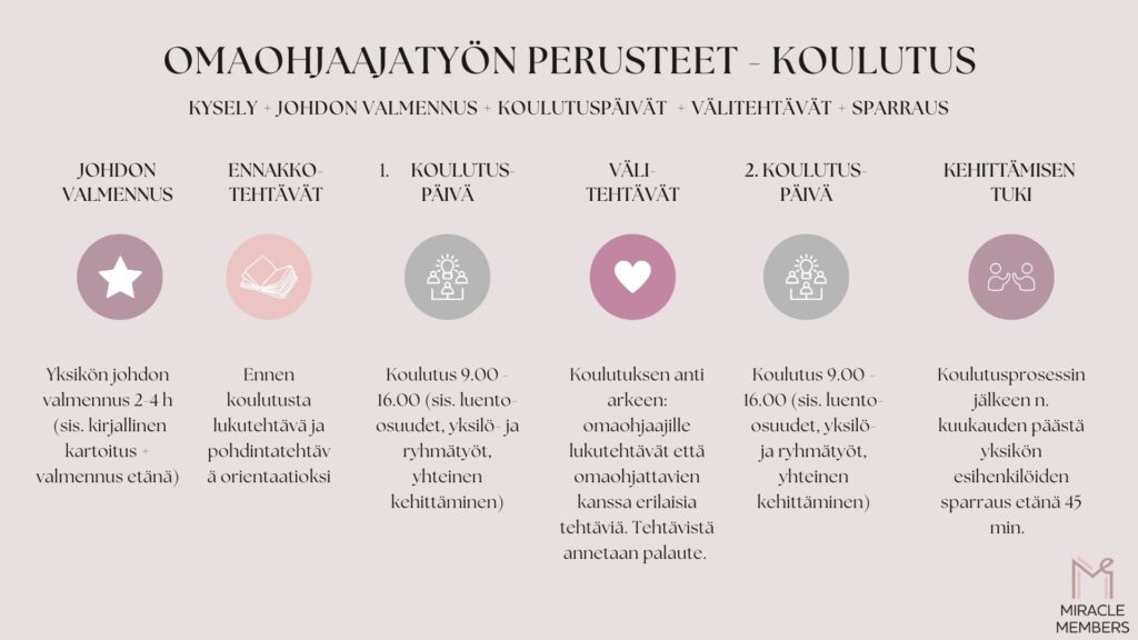 Miracle Membersin omaohjaajakoulutus on vaikuttava prosessikoulutus, joka tarjoaa teille mahdollisuuden kehittää omaohjaajatyöhön tasalaatuiset rakenteet niin, että jokainen omaohjaaja tietää selkeästi oman työnsä vastuut ja velvoitteet, työyhteisö tietää miten moniammattilisesti auttaa omaohjaajia työssään ja esihenkilöt saavat selkeät työkalut omaohjaajien tukemiseen vaativassa työssä.